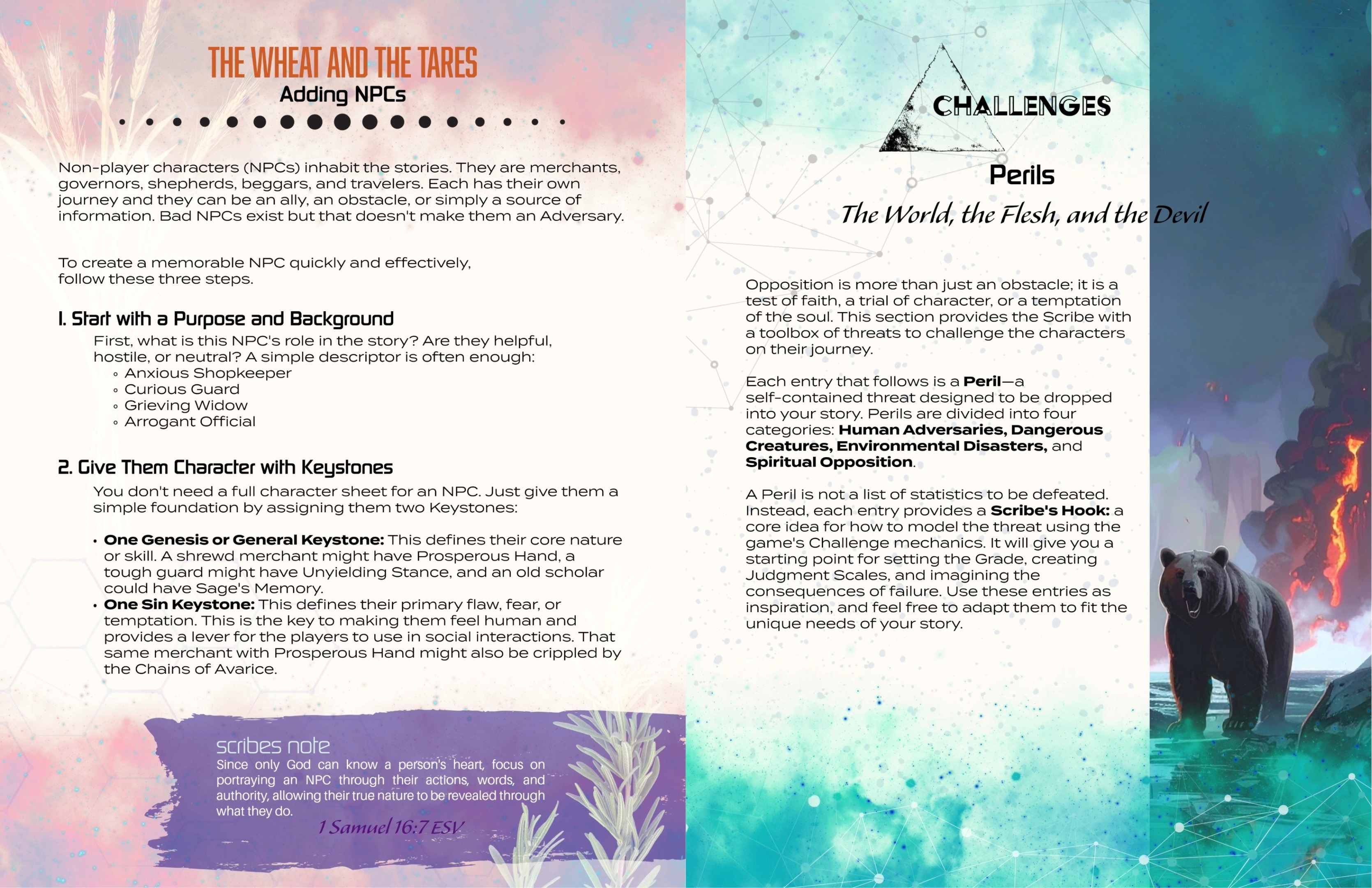 - Structured and Archetypal Characters: Your power comes from your Calling and your Keystones, which are explicitly linked to scripture. This curated approach provides immediate thematic weight and clarity, keeping the game focused and coherent.z