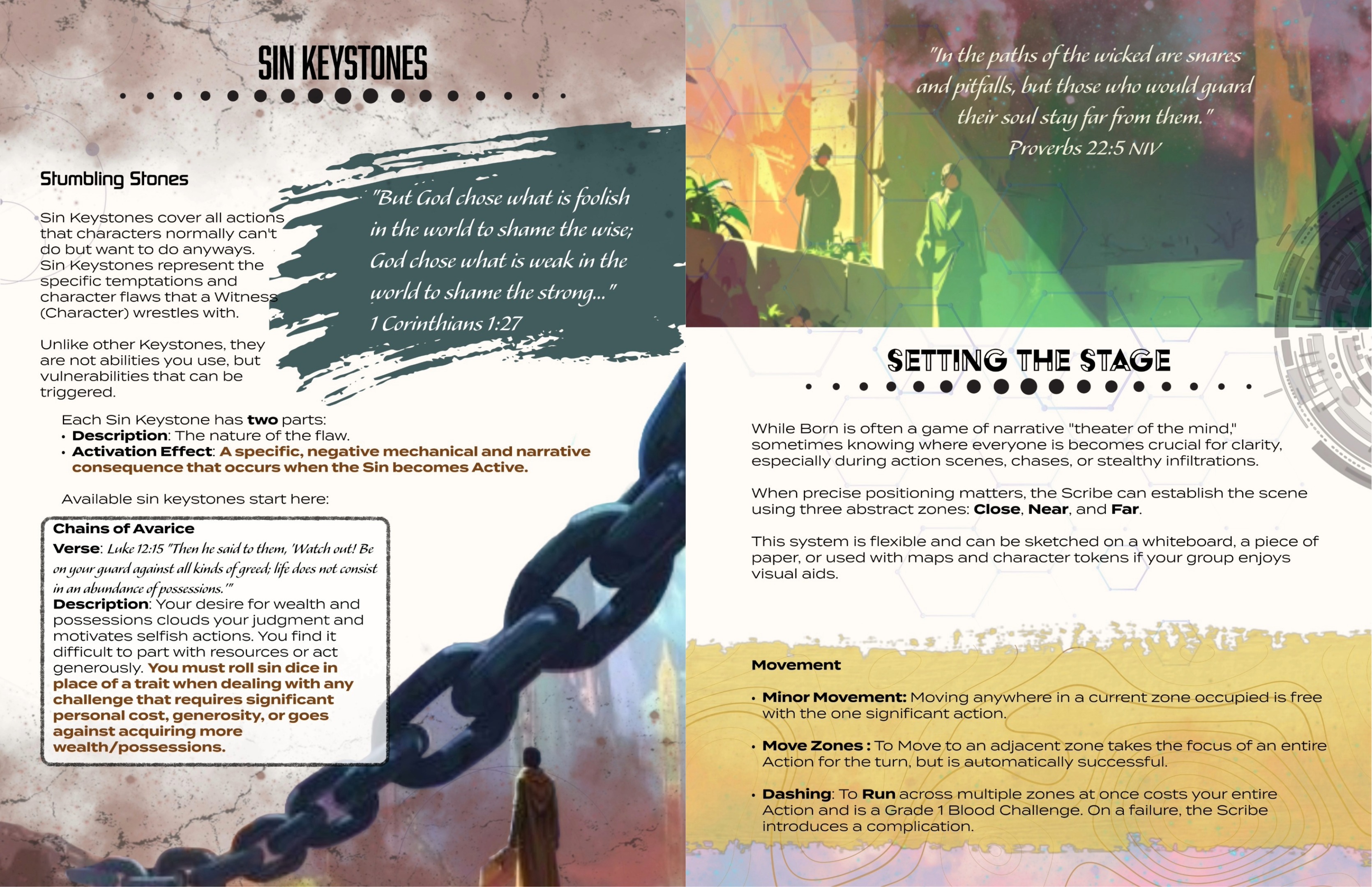 At its heart, BORN is a Thematic Game about a character's internal spiritual journey. While other games focus on exploring a world or pulling off a heist, BORN's mechanics are uniquely tuned to explore concepts of faith, sin, struggle, and redemption. Every roll of the dice and every point spent is an allegory for the theme.